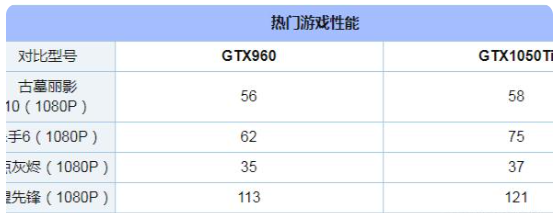 GTX1050Ti對比GTX960是每個游戲都是小勝,幾乎都在10%以內。