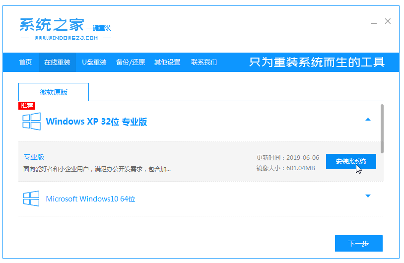 1、首先在官網上下載并安裝系統之家裝機大師,隨后打開軟件,點擊在線重裝,選擇xp系統。