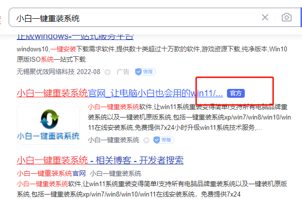 2、如果是通過瀏覽器等搜索引擎搜索的“小白一鍵重裝系統”,一定要認準官方二字,其余的夠不是正版。
