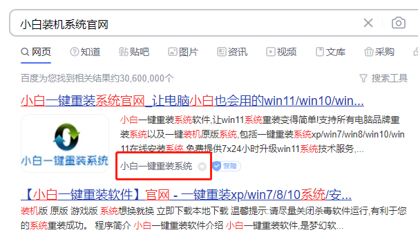 3、如果想搜索到的第一個就是小白官網,可以直接搜索“小白裝機系統官網”,這樣搜索出現的第一個就是小白正版官網,除了上面說的官方二字,也可以認準下面的小字“小白一鍵重裝系統”。
