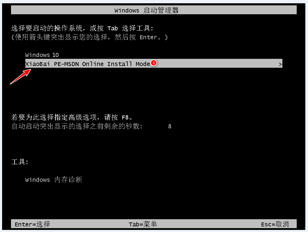 4、電腦重啟后進入了啟動頁面,選擇xiaobai-pe系統進入。