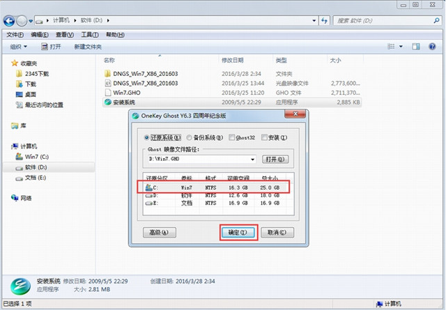 5、鼠標雙擊"安裝系統.EXE",選擇"C盤"(C盤為默認系統磁盤),插入映像文件Win7.GHO,單擊執行即可。