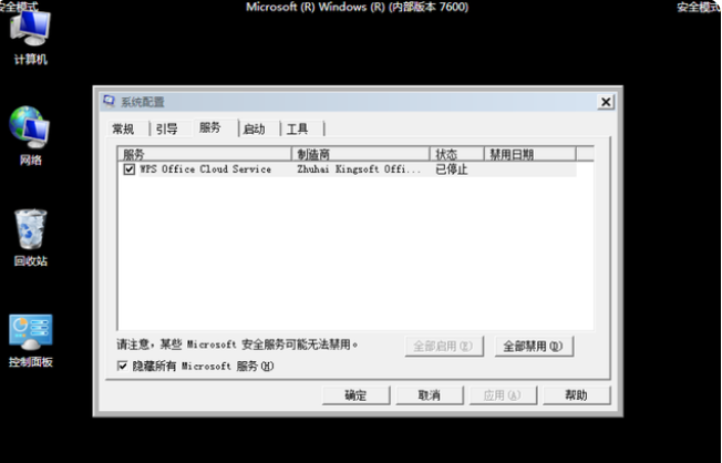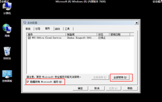 8、點擊隱藏所有Microsoft服務,點擊全部禁用,然后重啟即可。