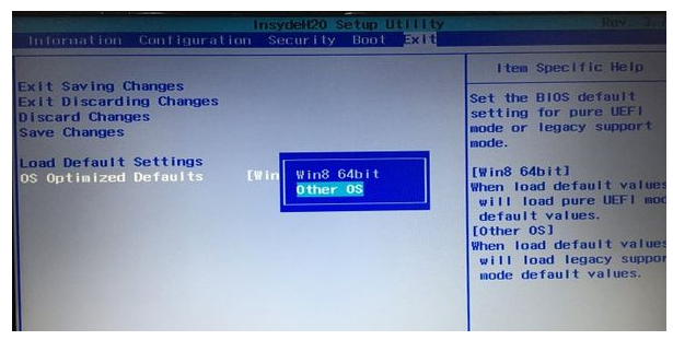 2、進入BIOS設置之后,按方向右鍵移動到Exit,選擇OS Optimized Defaults,回車,選擇Other OS,回車;