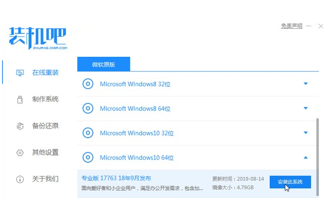 1、下載按照裝機吧一鍵重裝系統軟件并打開軟件,選擇win10系統。
