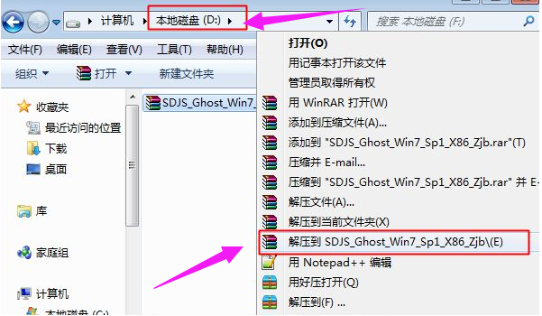 2.接著我們將ghost系統鏡像解壓到除C盤外的其他磁盤里面,保證磁盤空間足夠解壓。鼠標右鍵點擊使用WinRAR等工具解壓出來。