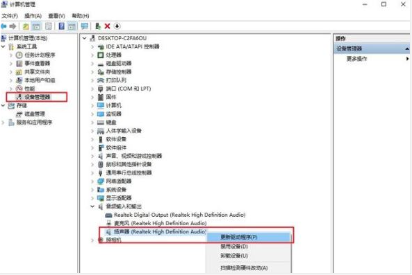 2、在計算機管理界面,點擊【設備管理器】,打開聲音設備,接著鼠標右鍵點擊對應的硬件設備并選中【更新驅動程序】功能。