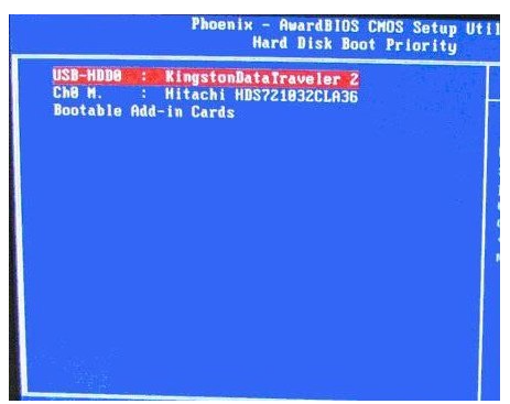 2、在高級BIOS設置(Advanced BIOS Features)界面中,點擊(硬盤啟動優先級)Hard Disk Boot Priority,之后進入BIOS開機啟動項優先級選擇,通過鍵盤上的上下鍵選擇USB-HDD。