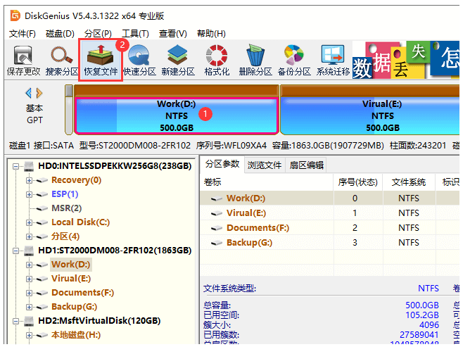 1、打開DiskGenius,選中丟失數據的分區,然點擊"恢復文件"按鈕。