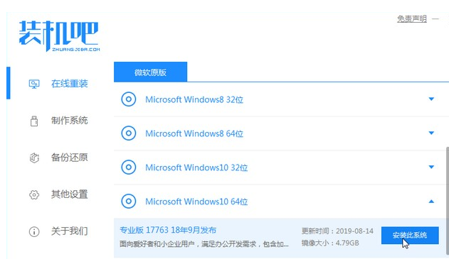 1、下載裝機吧一鍵重裝系統軟件并打開,選擇win10系統即可。