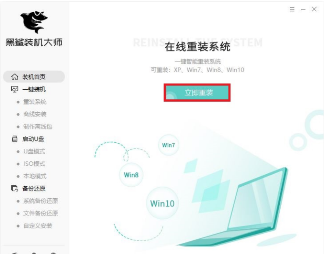1、下載安裝黑鯊裝機大師,點擊“立即重裝”。