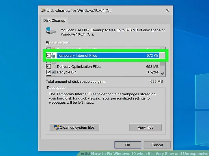 3、單擊以選中“Internet 臨時文件”和“臨時文件”旁邊的復選框。您將看到它們將在列的右側釋放多少空間。最后,點擊OK。該框將消失,您會看到刪除的進度條,完成后會消失。