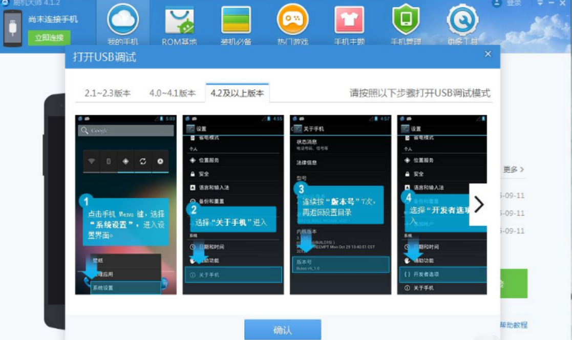 2、用數據線連接到電腦,在手機設置中找到USB調試開啟連接到刷機大師工具。