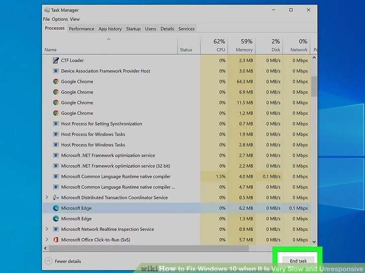 您可能在后臺運行了一些應用程序,這些應用程序使用大量能源并導致您的計算機運行緩慢。要查找標記為“高”CPU 使用率的程序,請轉到您的任務管理器(同時按Ctrl + Shift + Esc)。整理 CPU 面板,顯示正在運行的 CPU 最多到最少 CPU 的程序,然后右鍵單擊要關閉的程序并選擇結束任務。(如果您沒有看到顯示 CPU 或內存的面板,請單擊任務管理器窗口底部的更多詳細信息。)