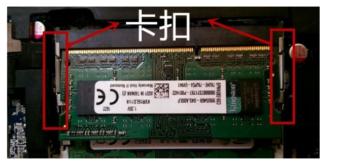 3、將內存條旁的卡扣摳開,使第一張內存條“站立”。