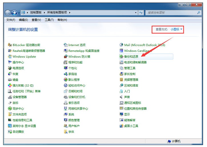 1、打開電腦的“控制面板”,將查看方式改為“小圖標”。點擊頁面中的“備份和還原”。