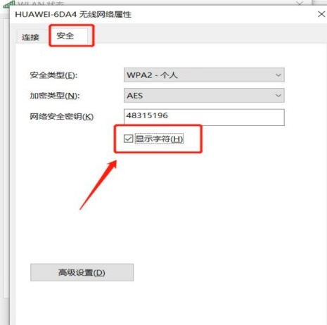 3、在彈出的無線屬性中,選擇安全,把顯示字符前面的勾勾上即可顯示你的wifi密碼
