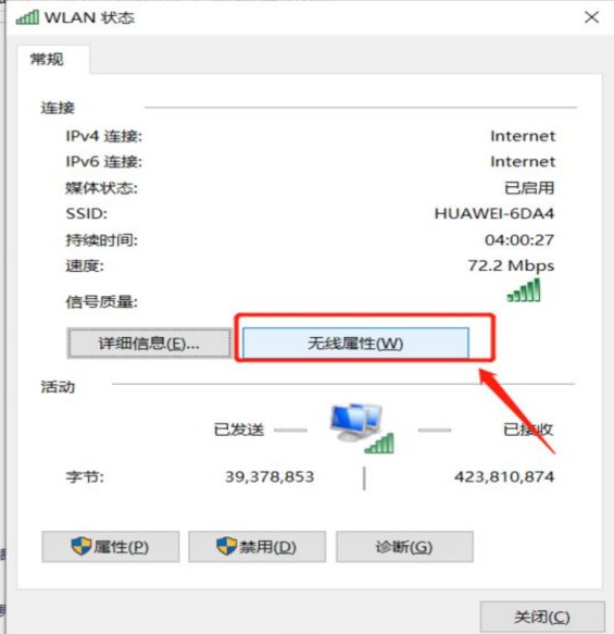 2.選擇已經連接的wifi連接,在彈出的WLAN狀態中選擇無線屬性。