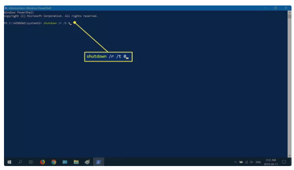3、接著輸入命令shutdown /r /t 0,然后按回車鍵。