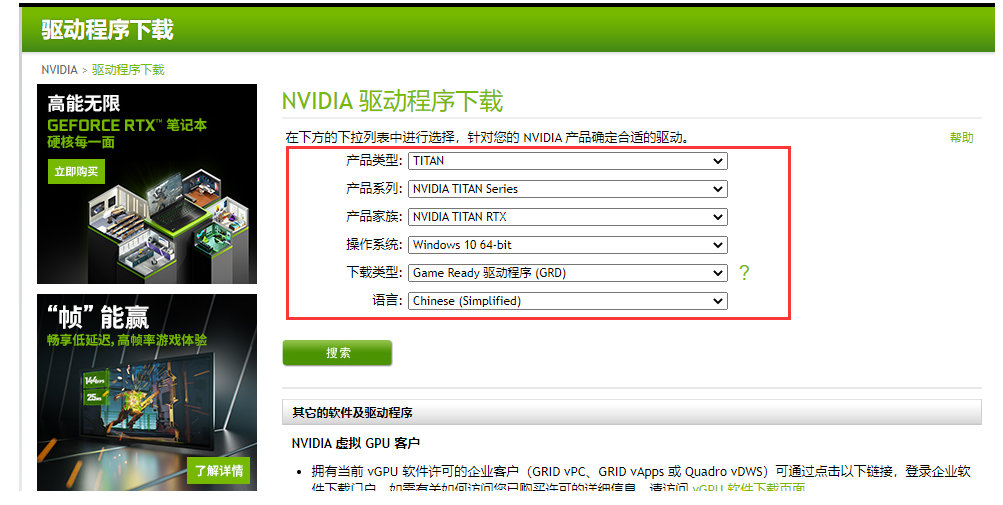 2、然后,選擇顯卡的產品型號,系列,操作系統,語言,完成以后點擊搜索。