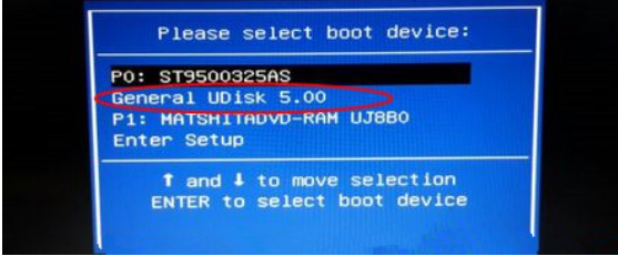 2、在需要重裝系統的電腦上插入U盤,重啟后不停按F12或F11或Esc等快捷鍵調出啟動菜單,選擇U盤選項回車,比如General UDisk 5.00,不支持這些啟動鍵的電腦查看第二點設置U盤啟動方法;