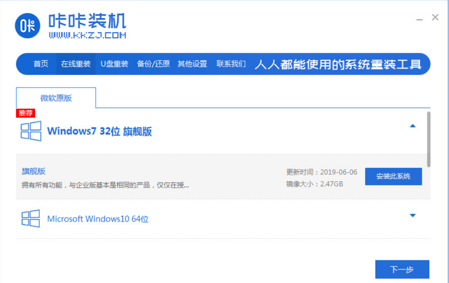 1、下載安裝咔咔裝機工具并打開,選擇需要安裝的系統版本,點擊下一步。
