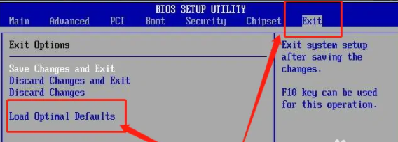 2、切換到Exit欄,點擊LoadOptimalDefaults進入設置。