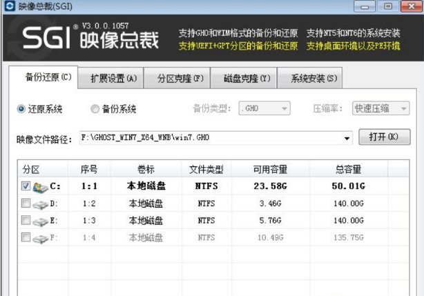 4、雙擊【安裝系統.exe】選擇【還原系統】,勾選要安裝的位置再勾選【執行完成后重啟】,最后點擊【執行】。
