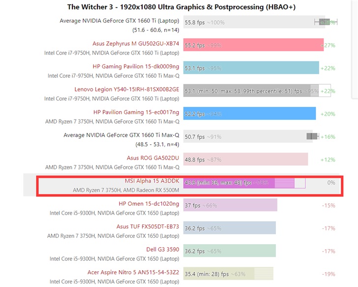 總的來看,Radeon RX 5500M的性能接近GeForce GTX 1660 Ti Max-Q。在《巫師3》中,R7 3750H+RX 5500M在1080p下可以達到43.6fps,相比之下R7 3750H+GTX 1660 Ti Max-Q則可以達到48.8 fps,性能差距在12%左右。同時,RX 5500M的性能也比GTX 1650的移動版高了15%。