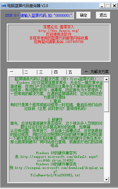 電腦藍屏代碼查詢器這是一款可以幫助用戶查詢電腦藍屏故障的工具,我們只需要輸入電腦提示的藍屏代碼就知道到底是哪里出故障才導致的藍屏,對癥下藥,更快的解決故障。