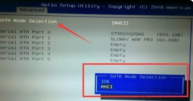 2. 我們嘗試將SATA模式選擇的硬盤模式更改為IDE,按F10保存即可。