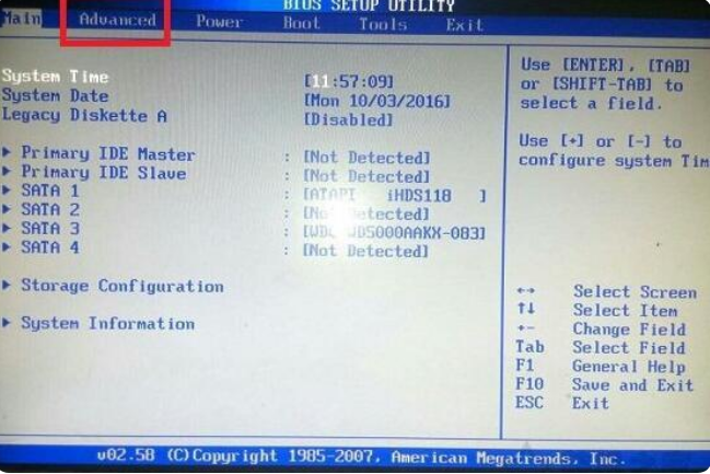 1、啟動電腦之后,點擊鍵盤上的“DEL”鍵進入BIOS設置頁面,選擇Advanced選項。