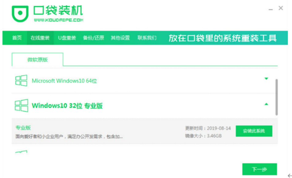 1、下載口袋裝機工具軟件,點擊在線重裝系統,選擇安裝的系統版本,選擇同時需要安裝的應用軟件后,點擊下一步。