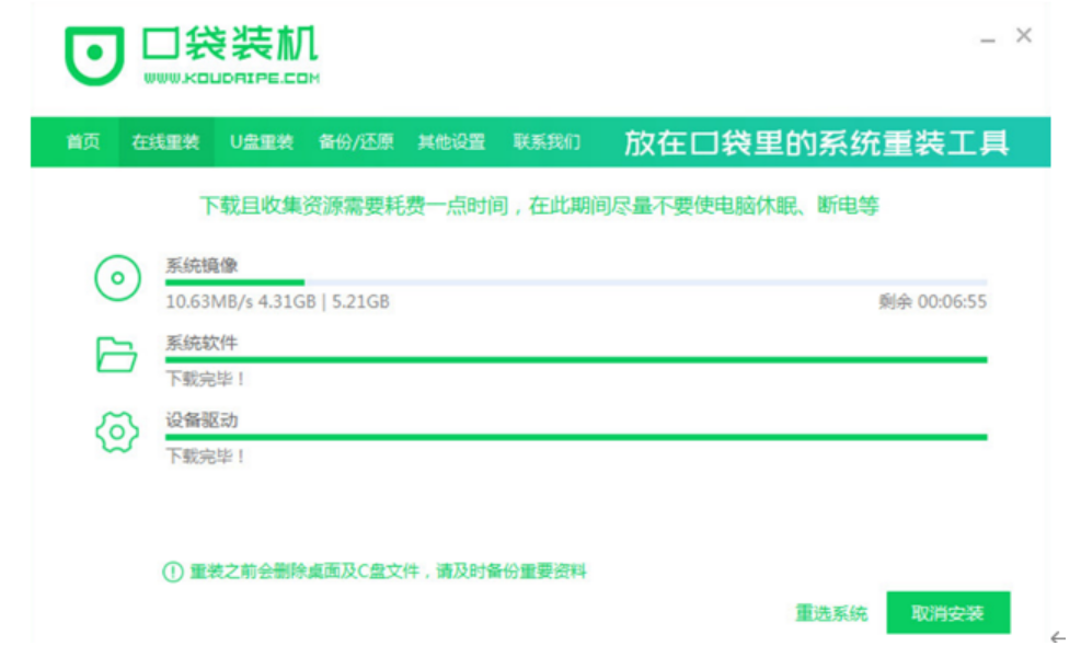 1、在電腦上下載口袋裝機工具軟件,打開點擊在線重裝系統。