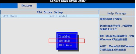 2.此時我們選擇“sata mode”并回車,彈出小窗口后,我們選擇“ide mode”選項,完成操作后按f10進行保存重啟即可解決藍屏0x0000007b代碼問題。