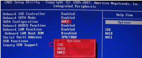 2.進入該頁面后,選擇“SATA Configuration”按下回車,彈出options選項框時,點擊“ide”,將模式設置為ide模式后按f10重啟。