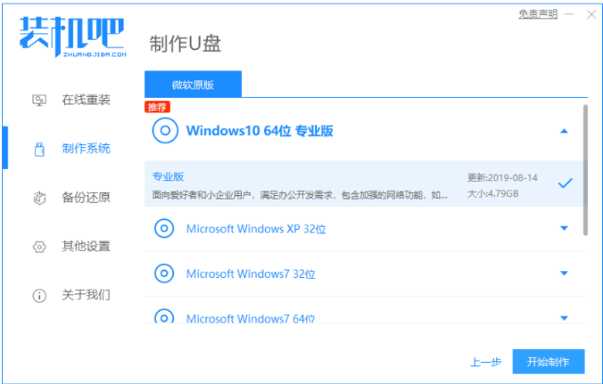 1、首先下載安裝裝機吧一鍵重裝系統軟件并打開,插入一個 8GB 以上 U 盤,點擊開始制作即可。