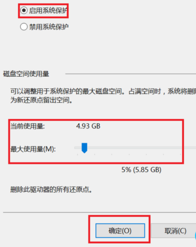 4、選擇啟用系統保護,磁盤空間使用量調整好磁盤空間使用量后點擊確定即可;