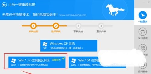 1、下載安裝小馬一鍵重裝系統軟件并打開,找到系統檢測的選項,然后點擊“選擇系統”。
