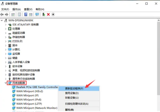 2、在設備管理器中,展開網絡適配器,右鍵當前的網卡選擇“更新驅動程序”。
