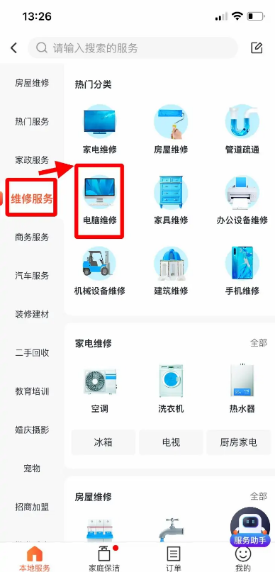 2、點擊左邊的"維修服務",點擊右邊的"電腦維修"。