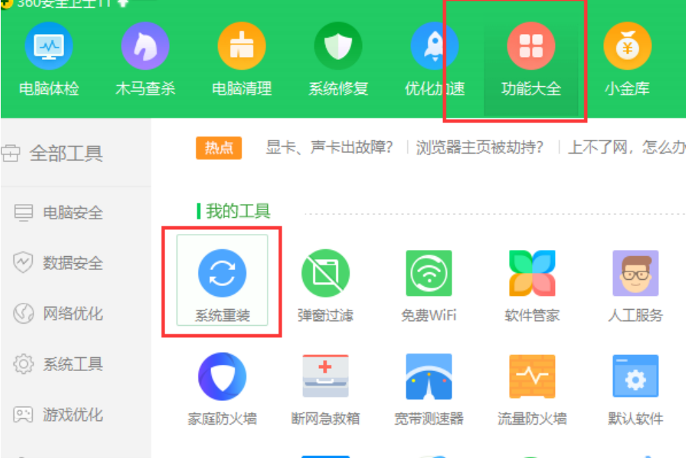 1.下載安裝360安全衛士,找到“系統重新安裝”選項。