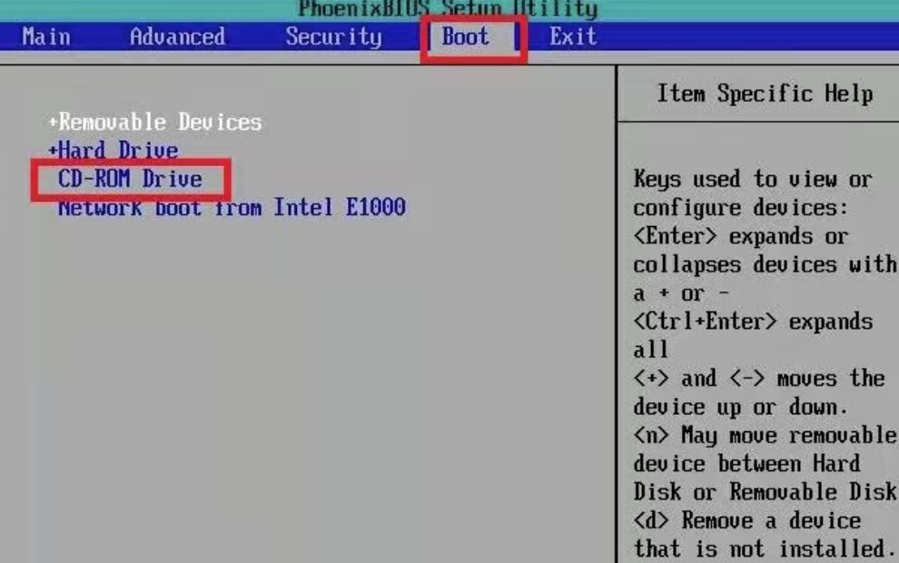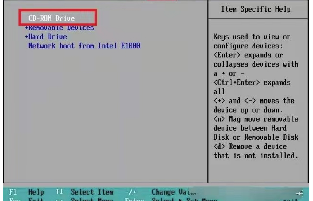 3、把第一啟動項改成CDROM按“+”鍵,把CD-ROM移動到第一項。