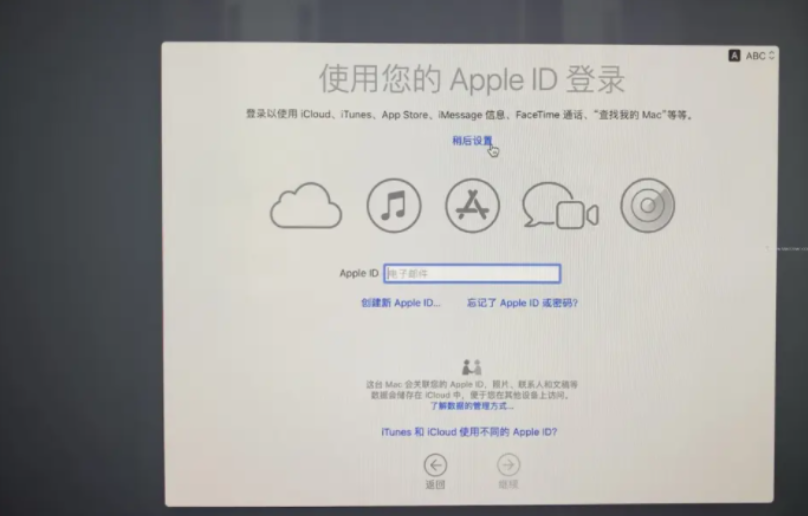 12、進入apple ID登陸界面,如果有ID的話,可以直接登陸,沒有的話,就選擇稍后設置,點擊跳過ID登錄。