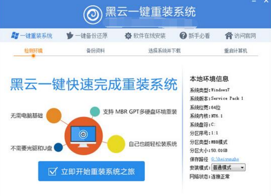 1、下載安裝并打開黑云一鍵重裝系統工具,然后自動檢測出當前分區模式、網絡狀態等。