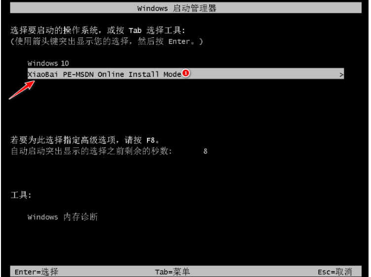 4、電腦重啟之后進入了開機選項頁面,選擇第二項,按回車進入xiaobai-pe系統。