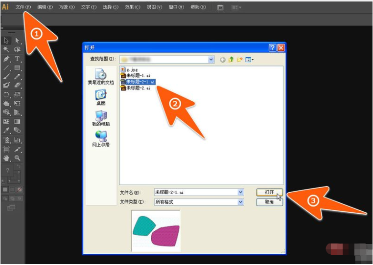 3、也可以通過點擊Illustrator軟件上的那個文件菜單,從里面點擊打開,再在打開窗口里找到要打開的那個AI文件,選中它,點擊打開按鈕。