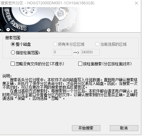 7、點擊"開始搜索",搜索整個硬盤丟失的分區數據進行恢復就可以啦。