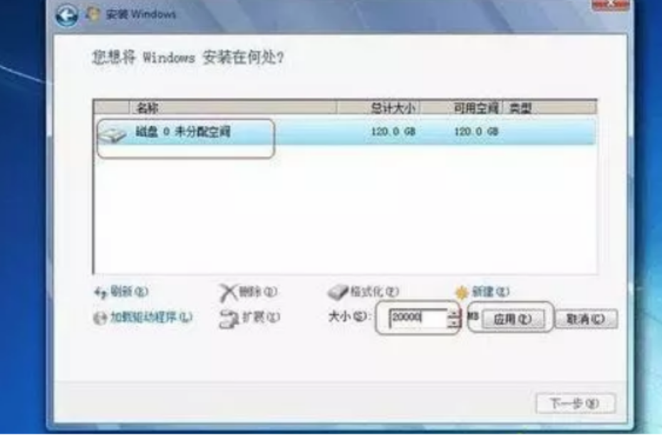 3、選擇未分配空間,單擊“新建”,輸入空間大小,1G=1024M,點擊應用即可。