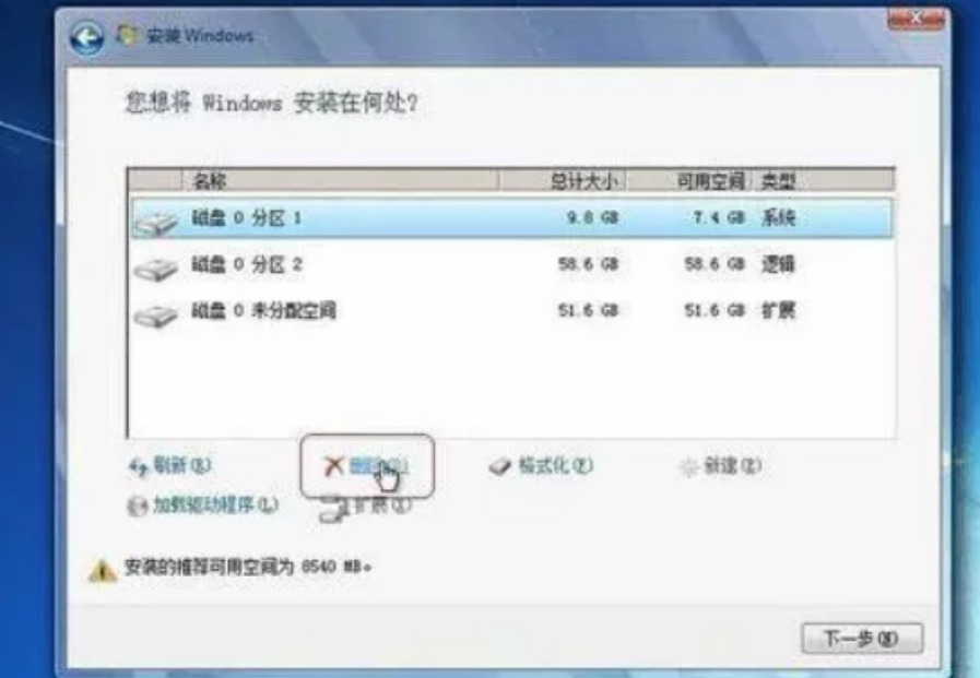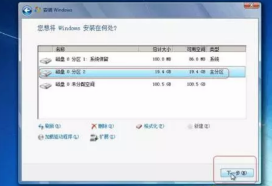 4、上述步驟完成分區后,我們選擇需要安裝的位置,點擊下一步就開始安裝啦。